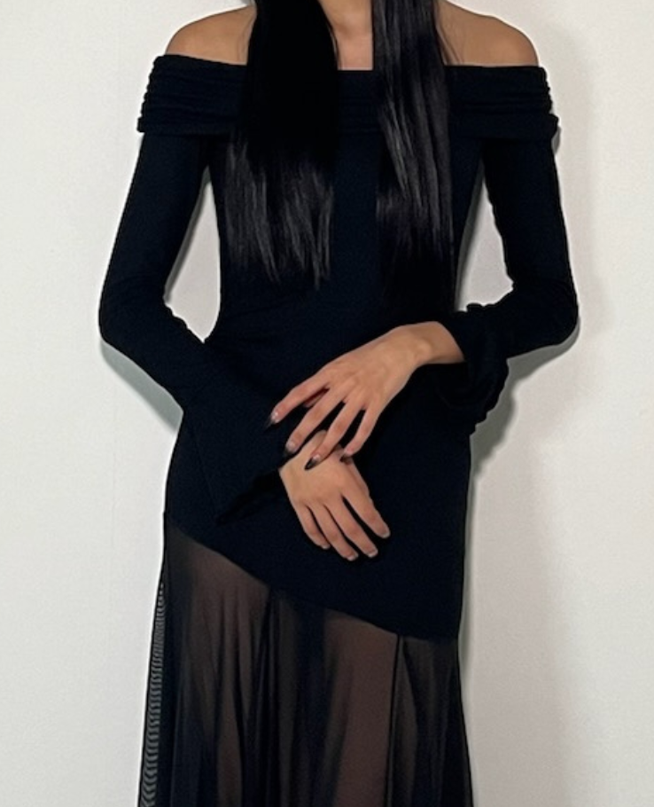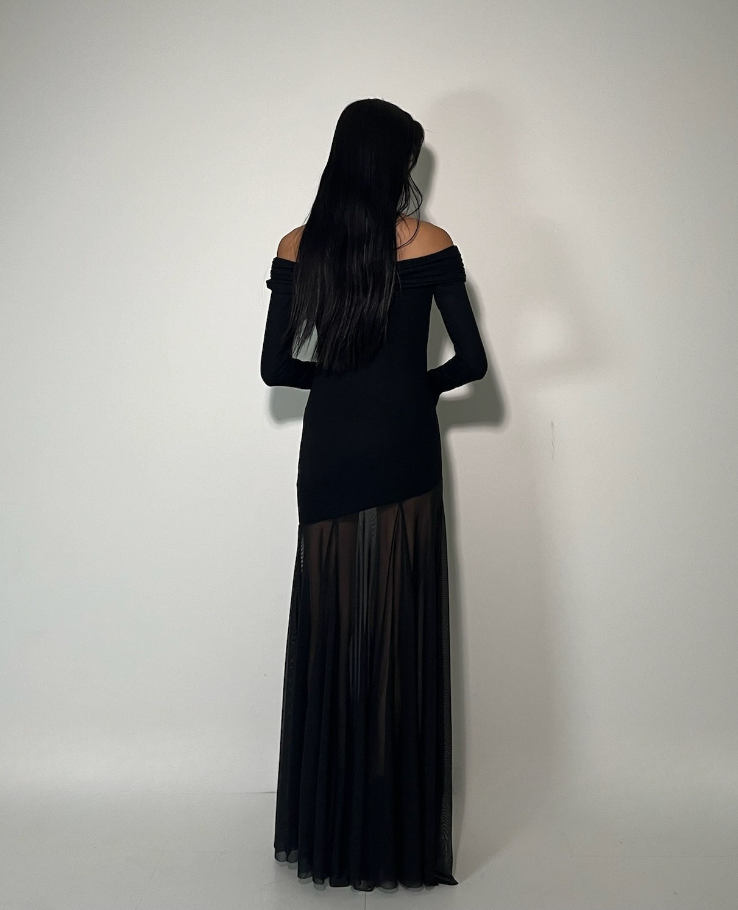 ほんのり肌が透けるオフショルダーが、女性らしいラインを美しく演出。