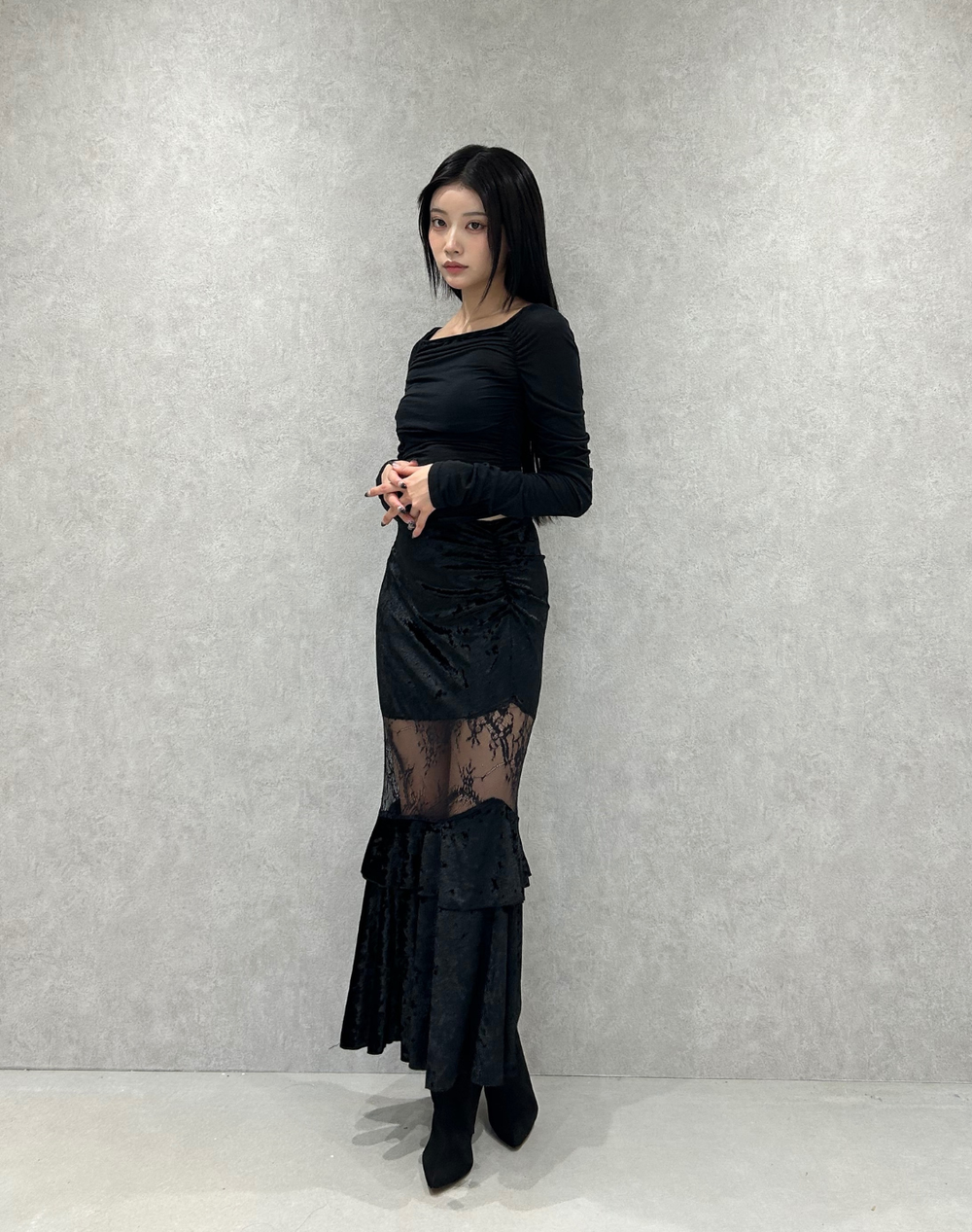 Veloa Lace Docking Long Skirt /ベロアレースドッキングロングスカート TR-10949